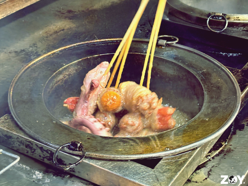 You can choose from a variety of skewers. They have meats, processed food, seafood, and vegetables (yes, they deep-fry the veggies).