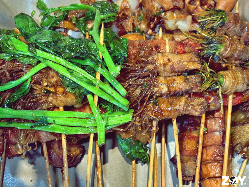 While the skewers are generally delicious, there are a few standouts: Bacon-wrapped sausages, broccoli, intestines, pork belly, and wood-ear mushrooms.