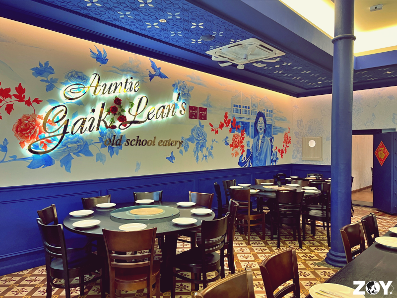 Auntie Gaik Lean’s is housed inside a former jewelry store. It has a modern Peranakan interior with a predominantly blue motif.